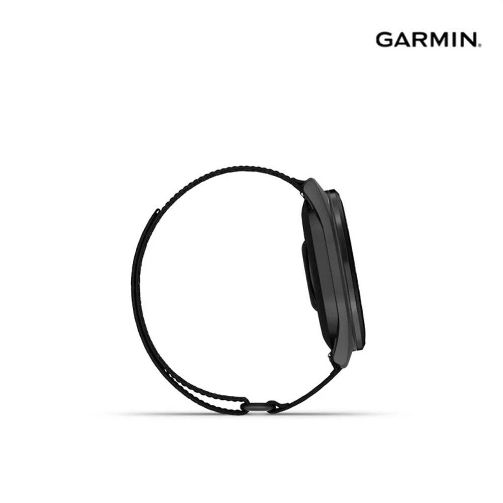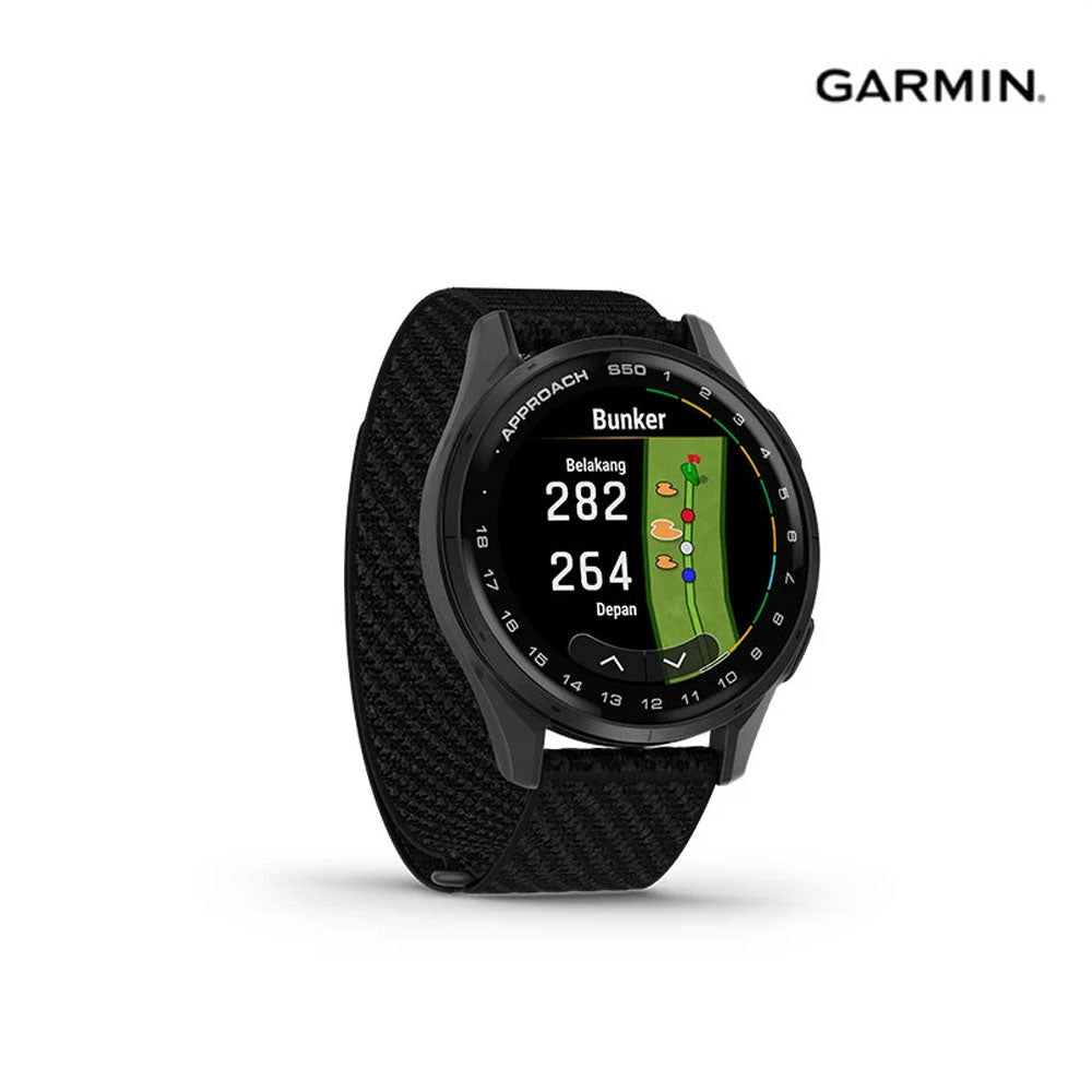 Berikut adalah detail dari Garmin Approach S50 43mm Golf GPS Smartwatch dengan tali nylon warna hitam dan bezel slate: